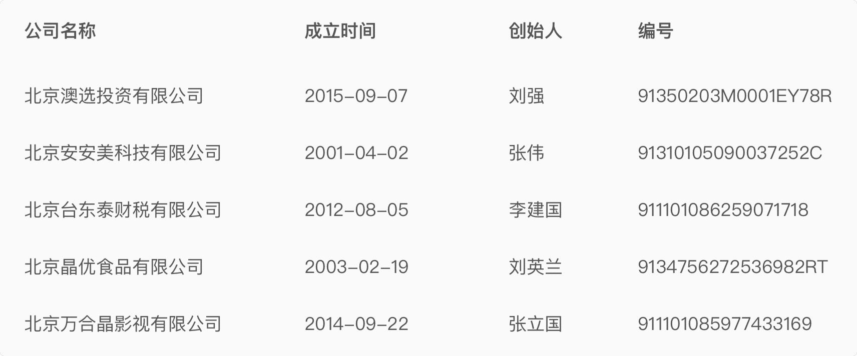 公司名稱 成立時(shí)間 創(chuàng)始人 編號(hào)